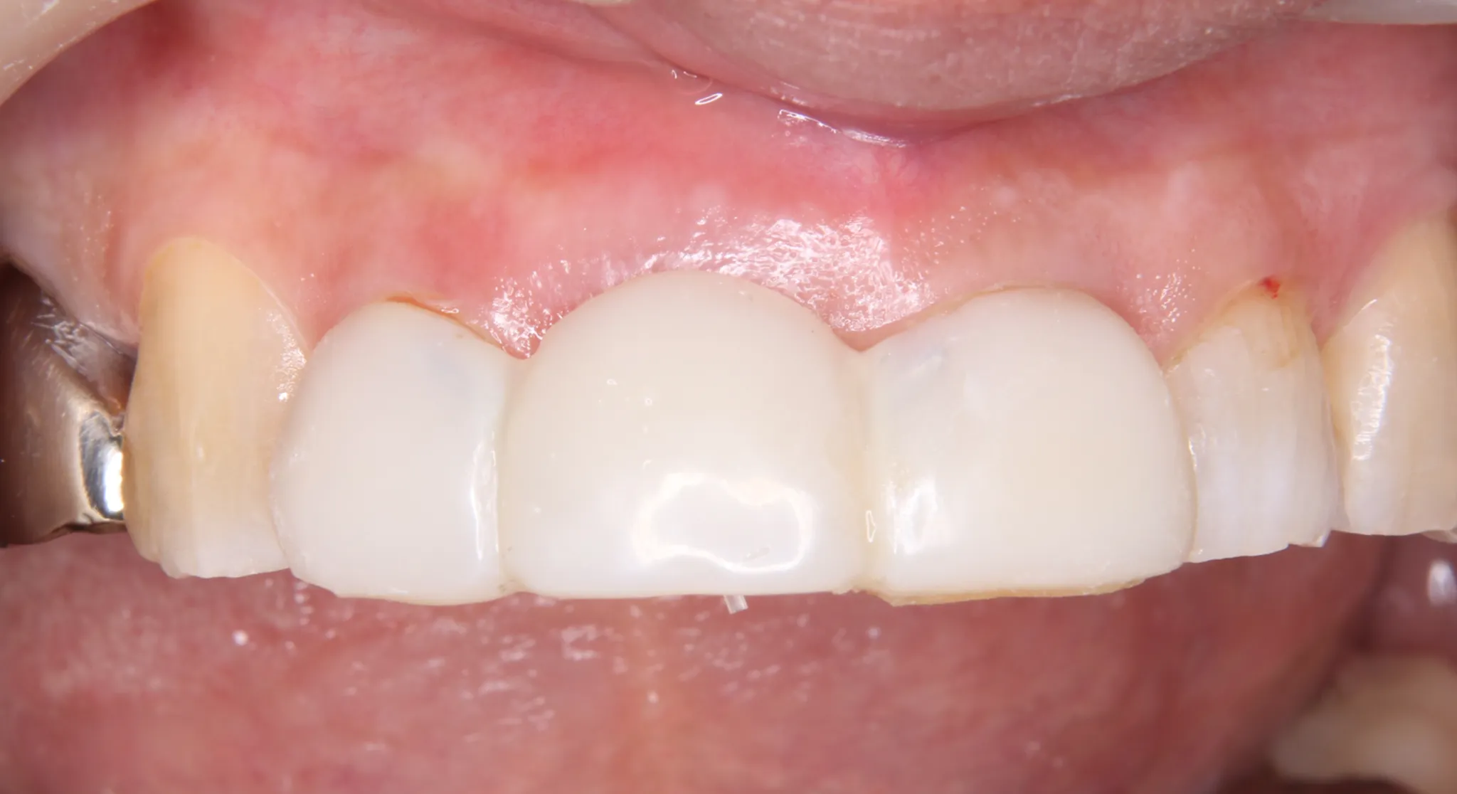 | 治療内容 | 歯が根元近くで折れていたため、そのままでは被せ物の維持が困難でした。マイクロスコープ下で精密に根の状態を確認し、歯根を少しずつ引っ張り上げる「エクストリュージョン(歯根挺出)」を実施。 健康な歯質を露出させることで、抜歯せずに歯を保存しました。挺出後は仮歯で安定を確認し、最終的にセラミッククラウンで修復しました。 |