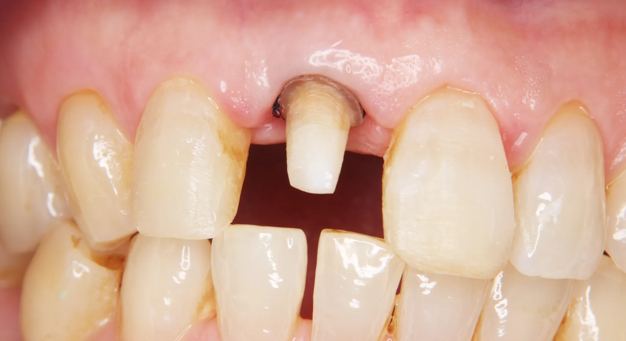 | 治療内容 | 歯が歯ぐきの下まで折れており、そのままでは被せ物ができない状態でした。歯根挺出(エクストリュージョン)を行い、歯の根をゆっくりと引き上げて健康な歯質の位置まで露出させ、歯を残す治療を実施しました。 挺出中は3Dプリンター製の仮歯を装着し、見た目を保ちながら歯ぐきの位置を安定化。挺出完了後にセラミッククラウンで修復し、自然な仕上がりで機能も回復しました。 |