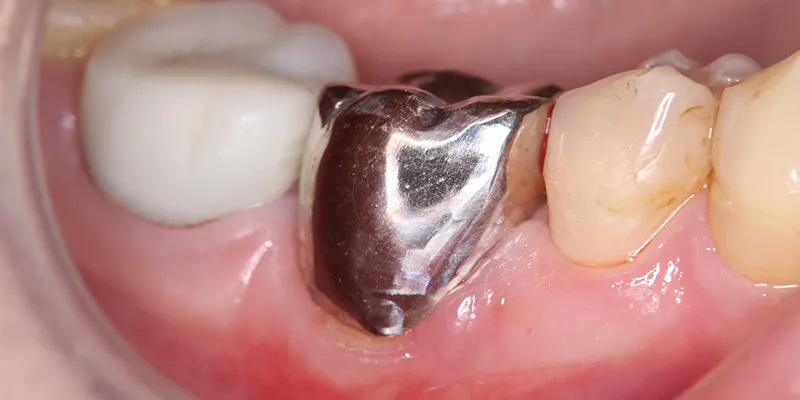 移植後はワイヤー固定で安定化させ、生着を確認したのちに保険内での根管治療と金属冠(FMC)補綴を実施。