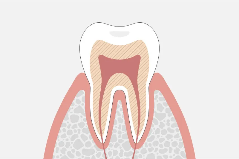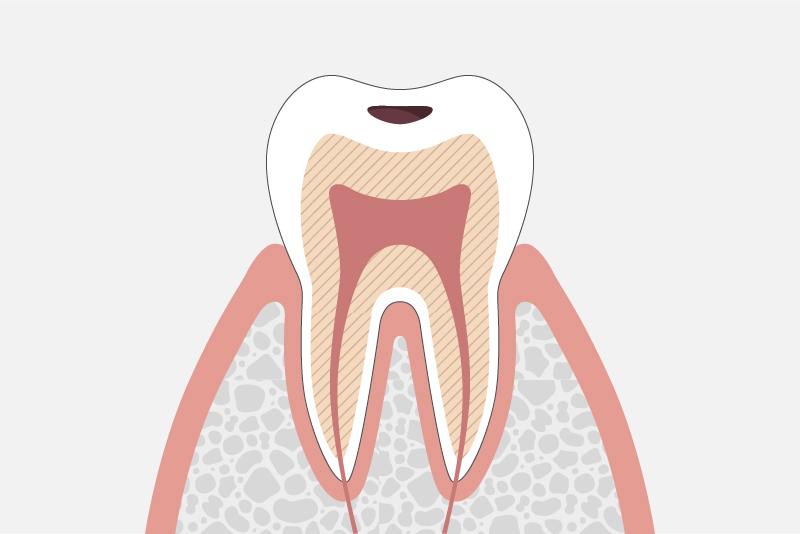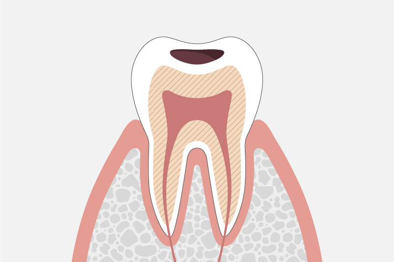 虫歯が象牙質まで達するとそこからの進行速度は早く、神経に近づくにつれ、冷たいものがしみたり、痛みを感じるようになります。