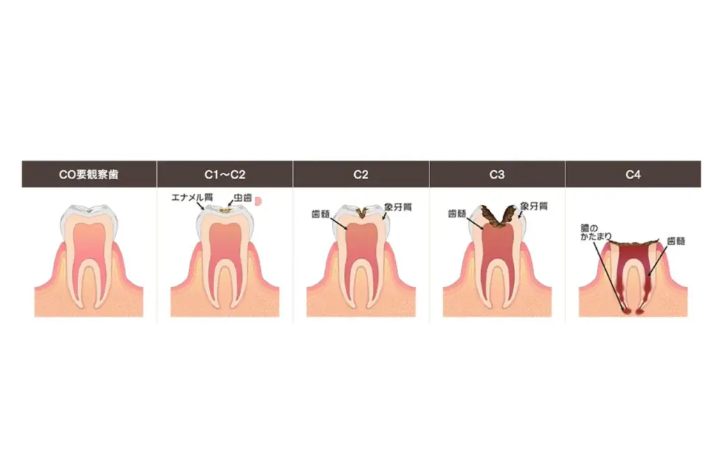 学生時代、歯科検診でC0(シーオー)C1(シーワン)など、耳にした事があると思います。虫歯は5段階評価され(C0→C4)レベルにより治療方法も異なります。個体差はありますが、一般的に上の表のように分けられます。それぞれの治療法については以下の通りです。