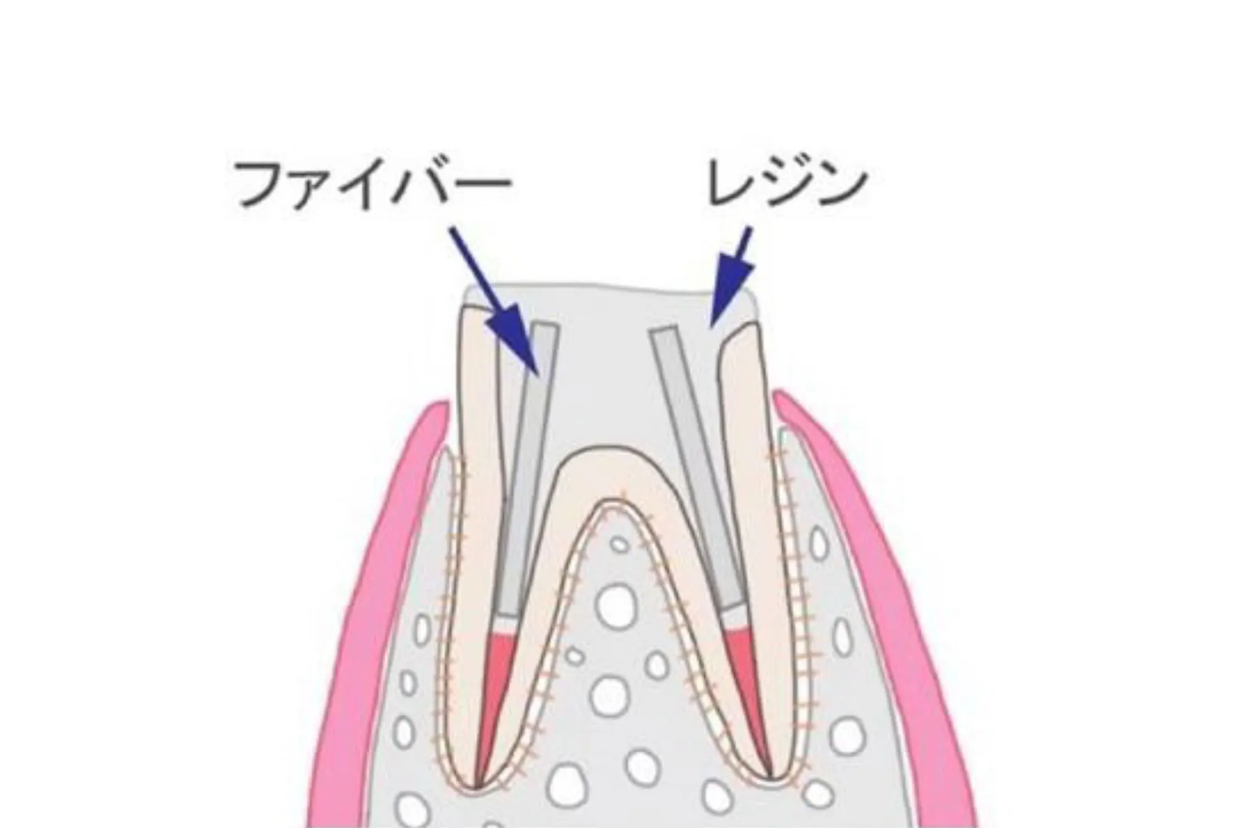 グラスファイバーのピンで補強したレジン(プラスチック)の土台です。歯質とより近い性質なので、メタルコアと比較すると歯質や接着剤とも一体化しやすいのが特徴です。